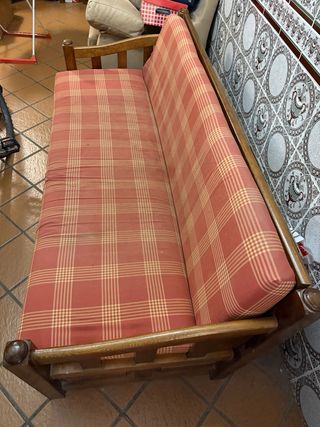 Acogedor sofá cama con estructura de madera maciza y un diseño rústico. - Tapicería de tela con estampado a cuadros. - Tonos marrones y rojizos en la tela. - Marco de madera robusto.