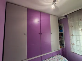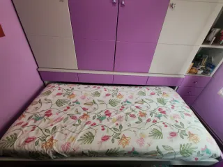Se vende dormitorio juvenil seminuevo con un diseño moderno y funcional. - Combinación de colores lacados morado y gris. Armario compuesto de tres módulos , 145X200cm , desde el suelo altura total 245cm Modulo central con 2 barras ,otro modulo con barra y baldas y otro modulo con baldas. -Cama para colchon de 90x190cm. -3 cajones bajo cama de gran capacidad. Estantería de baldas y cajones de 200 x50cm -Escritorio de 110x50cm. -Interitor armarios tipo melamina de fácil limpieza.