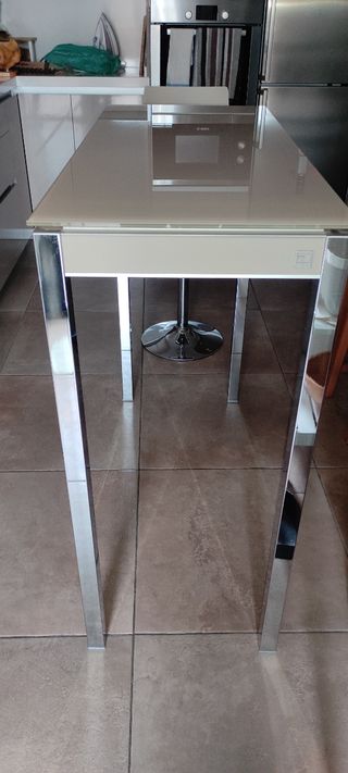 Mesa alta de cocina, tipo barra, con 3 taburetes regulables en altura, de acero inox, marca Cancio, materiales de alta calidad y seminuevo