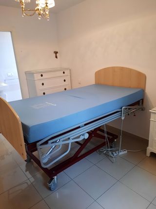 Cama eléctrica con colchón, cabecero, piecero y barandillas.Lamas antibacterias. Soporta hasta 135kg de peso.Ergonómica, gracias a su estructura adaptable, favorece una postura adecuada y sana para personas encamadas o con problemas de espalda. Incluye un mando para subir el cabecero, zona de los pies; además de subir toda la cama a diferentes alturas, de 38 a 80cm.Lamas antibacterias con varios canales q permiten la ventilación, fabricadas en material anti acaros y anti bacterias.Además sus materiales de fabricación permiten una fácil limpieza.Colchón de alta gama, q permite la total adaptación en la cama articulada, fácil limpiez