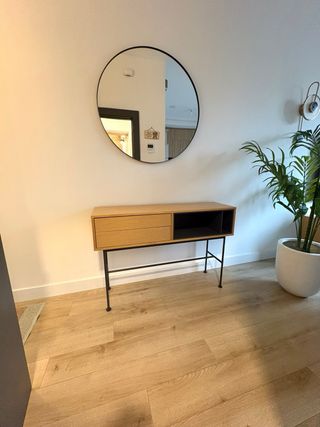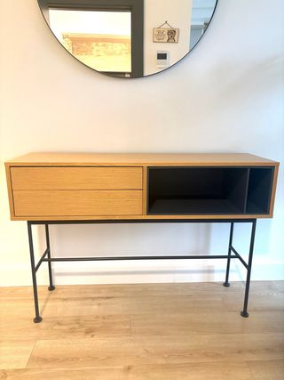 ¡Urge venta por mudanza! Elegante consola de diseño con acabado en roble y estructura de hierro. - Dos cajones para almacenamiento. - Compartimento abierto. - Patas finas de metal negro. Seminuevo en perfecto estado