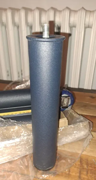 Juego de 5 patas para somier de hierro con acabado redondo y rosca métrica universal. Aptas para multitud de somieres. Seminuevas. Venían con el somier, pero las hemos cambiado por unas más altas. - Longitud de 26 cm. - Diseño cilíndrico. 5 cm de diámetro.