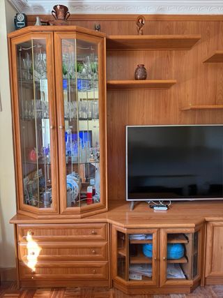 Elegante mueble de salón con vitrina y compartimentos. - Estructura principal de madera. - Puertas de cristal en la sección de vitrina. - Cajones y compartimentos de almacenamiento. Aceptamos negociación. No hacemos envío. El comprador tendría que recogerlo en Alcobendas, Madrid.
