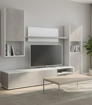 Conjunto de muebles de salón con un diseño moderno y funcional. Combina acabados en blanco y gris imitación cemento. - Mueble bajo de televisión con compartimentos. - Estantería vertical con puertas y baldas. - Mueble colgante con puerta y balda. - Estante decorativo superior. - Envio a contrareembolso - Nuevo de paquete