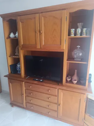 Mueble de salón de madera maciza de pino, ideal para organizar tu espacio. - Diseño robusto y elegante. - Amplio espacio de almacenamiento. - Acabado natural de la madera. Lo va a desmontar un carpintero para cambiar el suelo se puede aprovechar para llevarselo, no incluido transporte hay que venir y llevárselo.pago en el momento en efectivo. No incluye los adornos tv etc ,solo el mueble