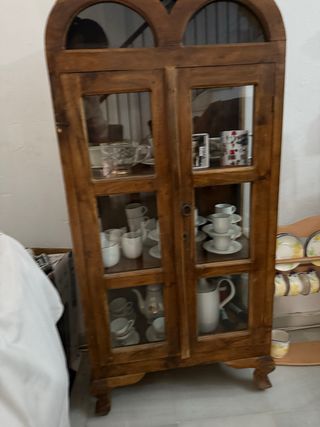 Vendo conjunto de muebles de madera para salón de estilo Rondeño compuesto por: - Aparador 165x44x88cms con 6 cajones y 2 puertas. - Vitrina 200x70x40cms con 2 cajones y 1 puerta. - Mesa extensible de 140x90cms (cerrada). - 6 sillas con decoración. En buen estado, me costó nuevo más de 2.000€. Nota: La vajilla, copas, vasos, tv, etc.... que están dentro de la vitrina y sobre el aparador NO están incluídos.
