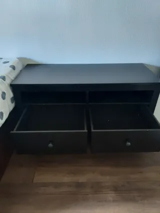 Mueble bajo de madera 110x46x57 con un diseño moderno y elegante. - Acabado en color negro y detalles en marrón. - Dos compartimentos abiertos. - Dos cajones con tiradores redondos.