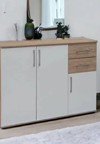 Mueble aparador de diseño moderno, totalmente nuevo y muy práctico. - Combinación de acabados en blanco y madera. - Diseño multiusos para diversas estancias.