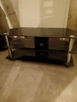 Elegante mueble para TV en color negro. Perfecto para cualquier salón. - Diseño moderno y minimalista. - Dos estantes con huecos. - Superficie de cristal brillante.medidas largo 88'5 cm.fondo 40 cm y alto 56 cm con ruedas