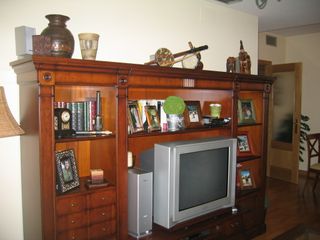 Mueble amplio de salón de estilo clásico, con un acabado en madera color cerezo. Robusto y en buen estado. Su diseño aporta elegancia y calidez al salón. - Diseño de líneas clásicas. - Acabado en madera de cerezo. - Espacio central para TV - Estanterias, armarios y cajones para libros, decoración o almacenaje. Se vende por cambio de mobiliario.