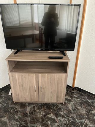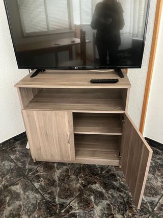 Mueble de televisión de 120cm, con dos puertas. Blanco y madera. En perfecto estado, como nuevo. La TV tambien esta disponible. 55 pulgadas en perfecto estado.