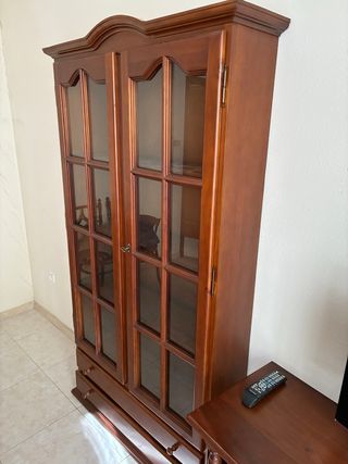 Se vende magnífico mueble de comedor en acabado madera de cerezo en perfecto estado de conservación. Es un conjunto robusto, de gran calidad. El mueble se compone de varios módulos independientes: Vitrina principal: Con dos puertas de cristal translúcido de gran formato y estantes interiores de vidrio. Módulo central de TV: Espacio amplio para televisión, con repisa superior decorativa (espejo y focos de luz integrados) y cajonera inferior de gran capacidad con diseño curvo. Módulo de estantería y almacenaje: Con puertas cerradas y espacios abiertos para decoración. Recogida en Cerdanyola del Valles.