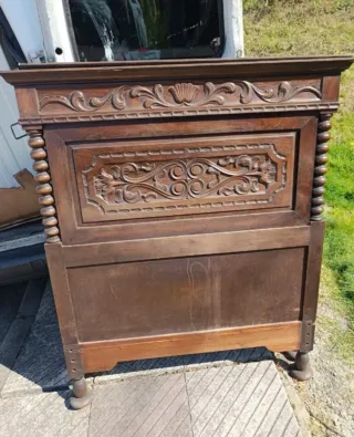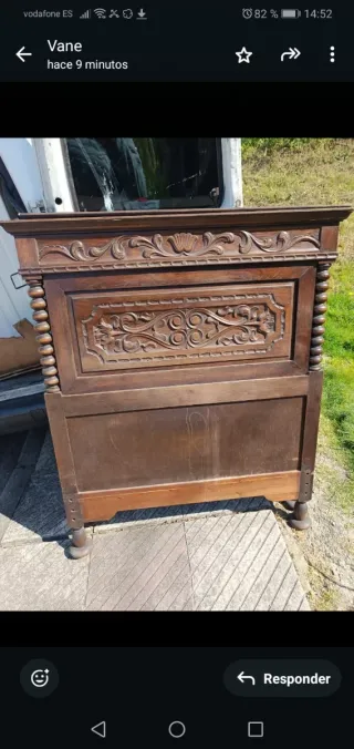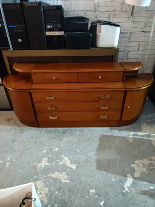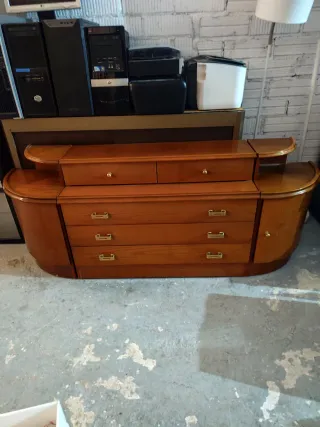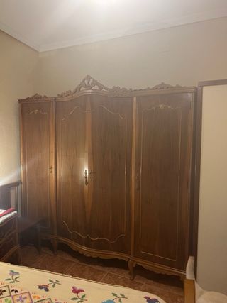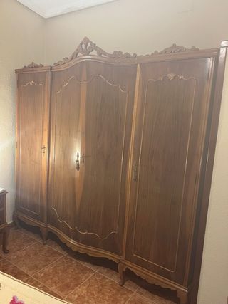Pieza de mobiliario con un diseño clásico y detalles tallados. - Estructura de madera robusta. - Frontal con ornamentación labrada. - Columnas laterales con acabado torneado. - Patas bajas con forma redondeada. Esta el armario es grande I e puesto una foto de una puerta lo demás esta en el locar y el lok le falta ala mesita también está I otro cabecero osea dos mesitas dos cabeceros I El armario