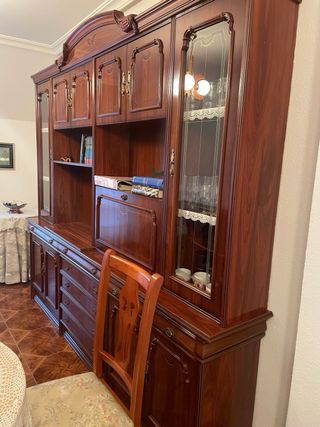 Elegante mueble de comedor de estilo vintage, con un acabado en madera oscura y detalles cobrizos. - Diseño clásico con puertas de cristal y ornamentación. - Amplio espacio de almacenamiento con estantes y cajones. - 100€
