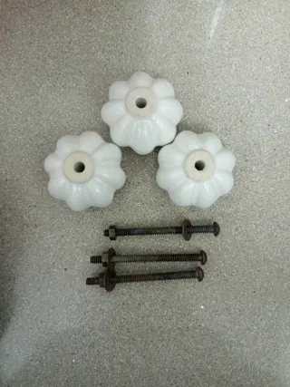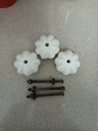 Conjunto de tres tiradores vintage con forma de flor. - Fabricados en cerámica blanca. - Incluyen tornillos y tuercas de metal. Peso 215 g