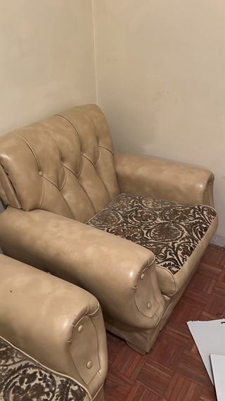 Conjunto de muebles vintage con estructura metálica y tapicería. - Diseño elegante con detalles ornamentales. - Perfectos para restaurar