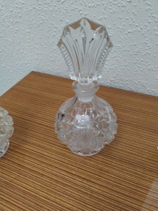 Elegante tocador de cristal con un diseño clásico. - Dos unidades disponibles. - Detalles tallados en el cuerpo. - Tapón decorativo con forma de abanico.