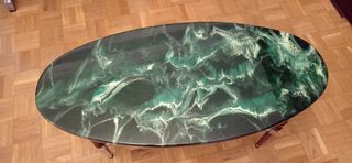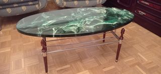 Elegante mesa vintage que ha sido restaurada con cuidado. Su diseño único aporta un toque especial a cualquier espacio. Se vende por cierre del negocio. - Base con detalles ornamentales dorados. - Tablero de madera con acabado cuidado.