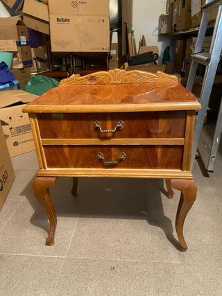 Mesita de noche de estilo vintage, con un diseño clásico y detalles tallados. - Requiere restauración. - Acabado en madera natural.