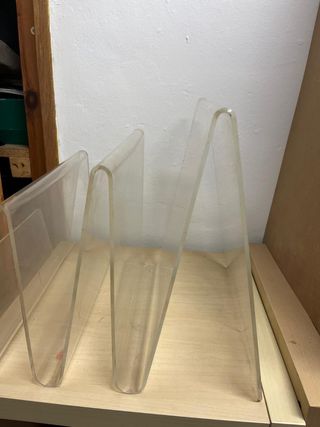 Elegante revistero de diseño vintage con un acabado transparente. Muy setentero. - Medidas: fondo 35 altura 32 i ancho 30cm - Fabricado en metacrilato. - Diseño escalonado de tres niveles.