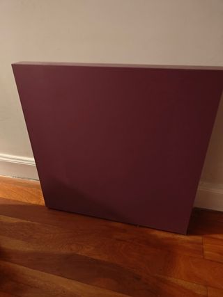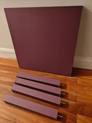 Mesa de madera maciza con patas torneadas. Color morado llamativo. Ideal para proyectos restauración, pisos vacíos. La mesa está desmontada, pero las patas se atornillan fácilmente. * Dimensiones: 50cmx 50 cm