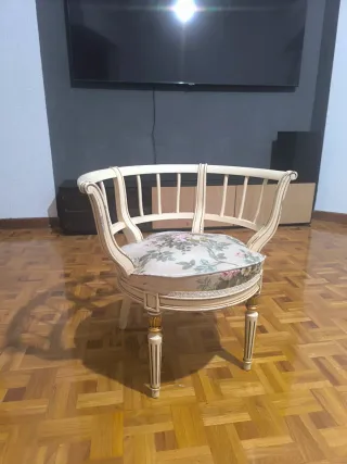 Elegante silla vintage con un diseño clásico y un tapizado floral. - Estructura de madera. - Tapicería de tela con estampado floral. - Patas con detalles dorados.
