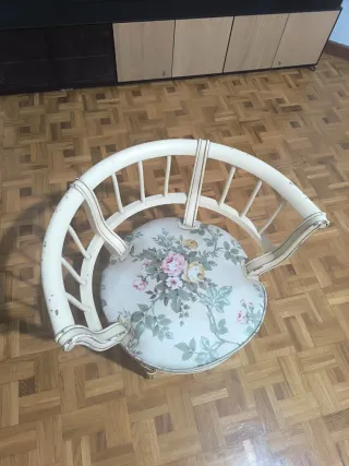 Preciosa butaca de estilo retro. Ideal para darle un toque vintage a tu hogar. - Asiento redondo. - Patas de madera. - Tapicería desgastada en algunas zonas. PARA RESTAURAR.