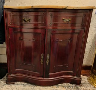 Elegante taquillón de estilo vintage con una superficie de mármol y estructura de madera. - Diseño clásico con detalles ornamentales. - Acabado en tonos marrones y dorados.