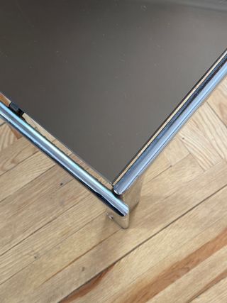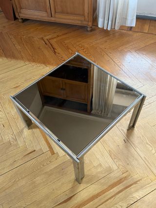 Disponible solo hasta el 5 de enero!! Elegante mesa de centro con un diseño que evoca la estética vintage. - Estructura de aluminio pulido - Superficie de cristal ahumado