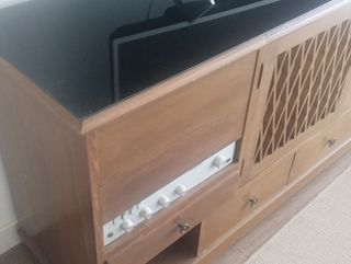 Precioso mueble antiguo de madera, ideal para amantes de la música y la decoración retro. Se encuentra en buen estado, mostrando señales normales de uso que le dan un encanto único. - Incluye un tocadiscos integrado. - Dispone de varios compartimentos y cajones para almacenamiento. - Acabado en madera marrón.