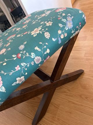 Preciosa banqueta de madera. Ideal como asiento auxiliar o reposapiés. - Estructura de madera marrón. - Asiento de tela, con estampado floral en tonos verdes y rosas, en perfecto estado. - Diseño sencillo y elegante. Se puede utilizar como asiento auxiliar, reposapiés o incluso como elemento decorativo.