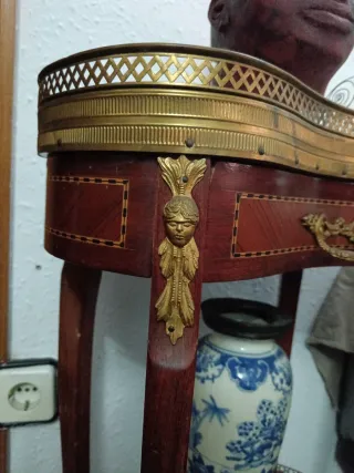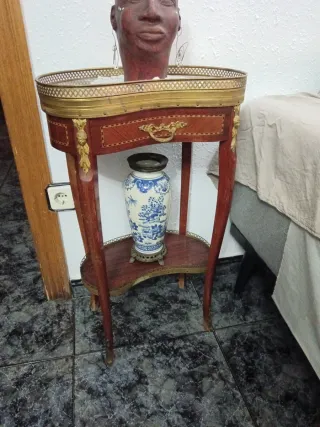 Preciosa mesa de madera, ideal para rincones. Tiene un diseño clásico y elegante. - Perfecta para colocar una lámpara y algún libro. - Se encuentra en buen estado, aunque presenta algunas señales de uso que le dan un encanto vintage. - Mide aproximadamente 60cm de alto.