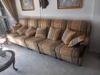 Amplio sofá de 8 plazas con un diseño elegante y cómodo. Incluye cojines a juego que complementan su estética. - Tapicería de tela con estampado. - Estructura de madera. - Cojines decorativos incluidos.