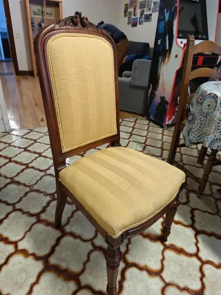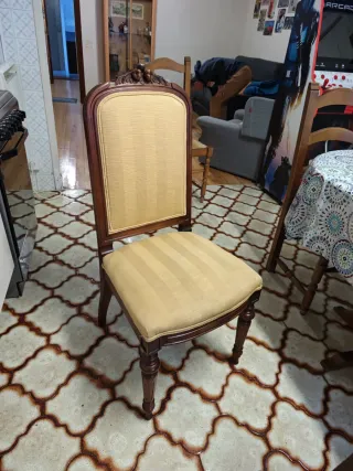 Conjunto de sillas de estilo vintage, perfectas para dar un toque clásico a tu hogar. - Estructura de madera robusta. - Tapicería de tela con un diseño elegante. Muy bonitas y en muy buen estado El precio es por cada una