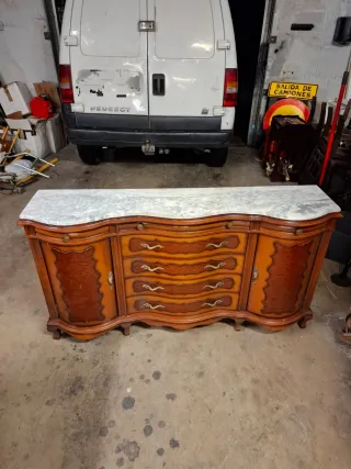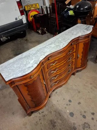Elegante mueble buffet de estilo vintage con una superficie de mármol y madera. Escucho ofertas - Diseño curvo y ornamentado. - Tiradores metálicos. - Patas talladas.