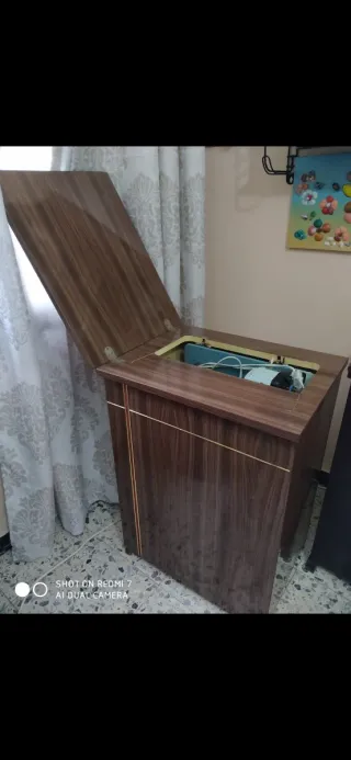 Máquina de coser Sigma vintage con su mueble original. - Diseño clásico en color azul. - Mueble de madera con compartimentos en perfecto estado. Se trata de una máquina de coser que tiene un soporte de madera de color marrón claro y tiene una superficie amplia en la que hay espacio para la máquina y para colocar cualquier objeto al lado. Es una máquina ideal para tenerla en el hogar si te gusta coser. Como se puede observar en las fotografías se encuentra en buenas condiciones y funciona correctamente. 📐 Medidas (ancho x fondo x alto): 114/57x44x79cm