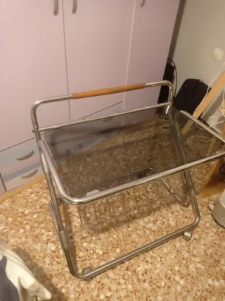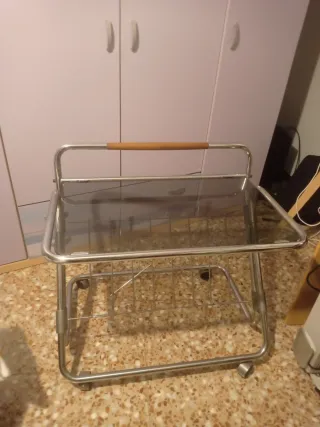 Elegante carrito de servicio antiguo, ideal para añadir un toque retro a tu hogar. Se encuentra en buen estado. - Dos bandejas de madera. - Estructura metálica cromada. - Diseño plegable.