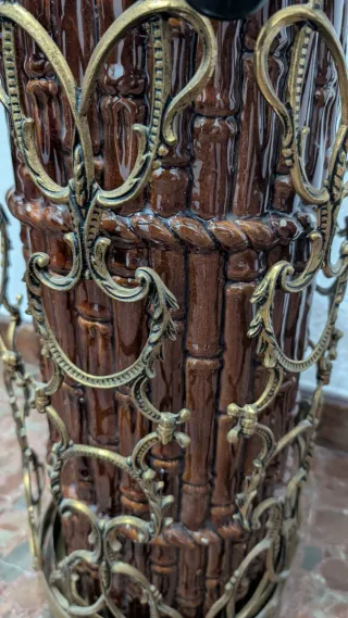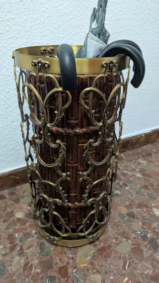 Elegante paragüero de estilo vintage con un diseño que evoca la textura del bambú. - Cuerpo principal en cerámica con acabado marrón brillante. - Detalles ornamentales y estructura exterior en metal dorado. - Diseño abierto que permite ver el interior. El diseño es bastante clásico/rococó, muy típico de decoración española de los años 60-80.