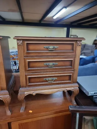 Conjunto de dos mesillas de noche de estilo vintage. Piezas de madera con un diseño clásico y elegante. Tenemos servicio de entrega en logroño Llamanos o escribenos 641706334 - Acabado en madera oscura. - Tiradores ornamentados. - Patas talladas.