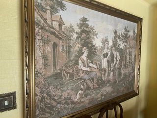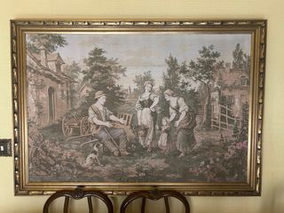 Este tapiz vintage presenta una escena campestre detallada con figuras y arquitectura. - Diseño intrincado con tonos beige y marrones. - Tejido de alta calidad.
