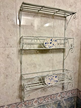 Estantería de estilo vintage con un acabado en color beige y detalles decorativos en azul. - Estructura metálica. - Dos baldas. - Adornos cerámicos con diseño floral. - Perfecta para baño o cocina. No se hacen envíos