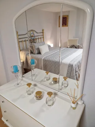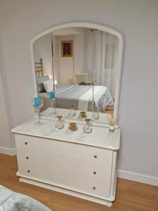 Mueble de dormitorio de matrimonio con un diseño elegante compuesto por dos mesitas, cómoda con espejo y cabezal metálico. En muy buen estado - Acabado en blanco brillante. - Detalles dorados. - Cajones con tiradores metálicos. Medidas: - Cómoda alto 68 x 1,12 largo x 44 ancho - Espejo alto 106 x 102 ancho - Mesitas alto 48 x 60 largo x 34 ancho - Cabezal alto 140 x 145 ancho