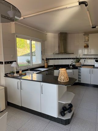 Conjunto de muebles de cocina con acabados en madera y detalles en cristal. - Encimera de marmol - Armarios superiores con puertas de cristal. - Muebles inferiores en madera. - Fregadero de dos senos de aluminio - Mesa - Cocina - Campana extractora