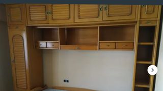 Vendo mueble completo de habitación juvenil en color cerezo claro con detalles en verde. Ideal para habitación juvenil, con gran capacidad de almacenaje. En algunas fotos puede verse algo más rojizo, pero es efecto de la luz. - El mueble está bien cuidado y en buen estado general. - Todas las bisagras están en perfecto estado. - El único desgaste apreciable está en la cama, tal y como se muestra en las fotos. - El módulo de la cama es doble, con otra cama guardada en el cajón inferior. - Ambas camas incluyen su somier. - Tamaño máximo de colchón: 190 x 90 cm (colchones no incluidos). Cualquier duda no dudes en contactar.