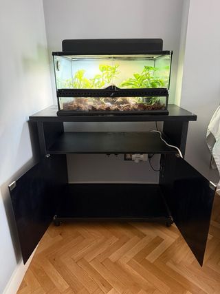Mueble de almacenamiento con un diseño moderno y elegante. Para terrario exo terra u otro uso. - Acabado en madera negra. - Puertas frontales de cristal transparente. - Adicionalmente le puse ruedas Puertas dobles de apertura frontal, cierres magnéticos de tacto suave, estante de almacenamiento interno, parte trasera abierta para gestión de cables. Dimensiones (Ancho x Profundidad x Alto): 91.5x46.5x70.5 cm
