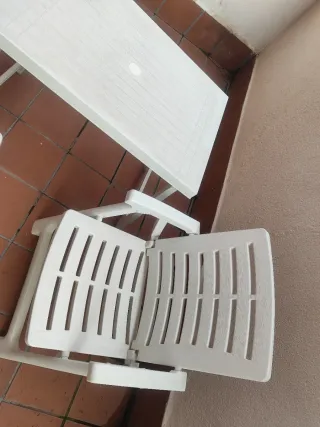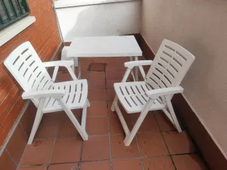 Conjunto de mesa y dos sillas para terraza o jardín. Ideal para disfrutar del aire libre. - Mesa rectangular. - Sillas plegables. Entrega en Aranjuez, Vallecas o Leganés.