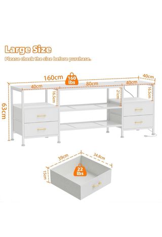 Mueble de televisión moderno con un diseño elegante que combina blanco y madera. - Dos cajones frontales con acabado en madera. - Compartimento abierto superior. 130 de largo, 40'5 ancho, 35'5 de alto.