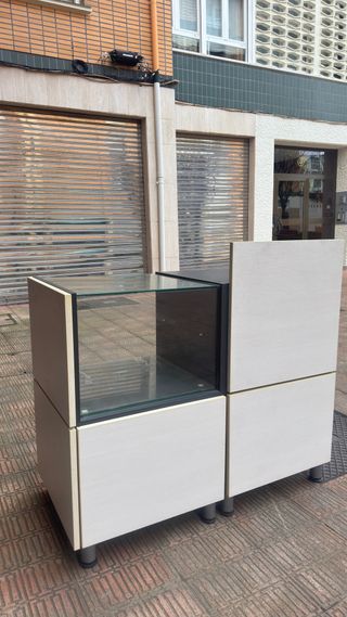Mostrador modular profesional, perfectas condiciones (solo necesita limpieza). CARACTERÍSTICAS: ✅ Melamina blanca decapado (acabado elegante) ✅ Vitrina cristal templado (parte superior) ✅ Huecos traseros para TPV/ordenador/cajón ✅ Patas metálicas regulables ✅ Aprox. 95 cm ancho × 50 cm fondo × 110 cm alto IDEAL PARA: Tienda, farmacia, óptica, joyería, recepción Comprado en tienda equipamiento comercial Bilbao. Uso ligero. PRECIO: 250 € VENTA: Solo recogida en mano Baracaldo. Ayudo a cargar.