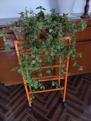 Conjunto de planta natural con jardinera y mueble metálico. - Mueble de metal con ruedas.altura 78 cms, ancho 22 y largo 38 cms - Jardinera de plástico