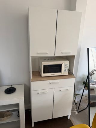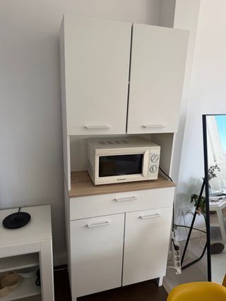 Mueble auxiliar de cocina con un diseño moderno y funcional. - Dos puertas inferiores con tiradores. - Un cajón central. - Espacio abierto para microondas. - Dos puertas superiores.